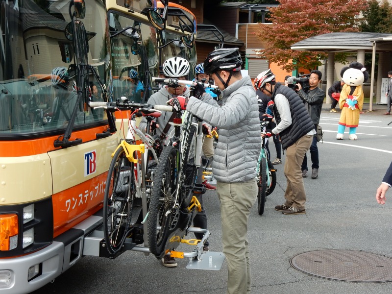 自転車を載せる棚「サイクルラック」を取り付けた路線バスの運行が九日から、